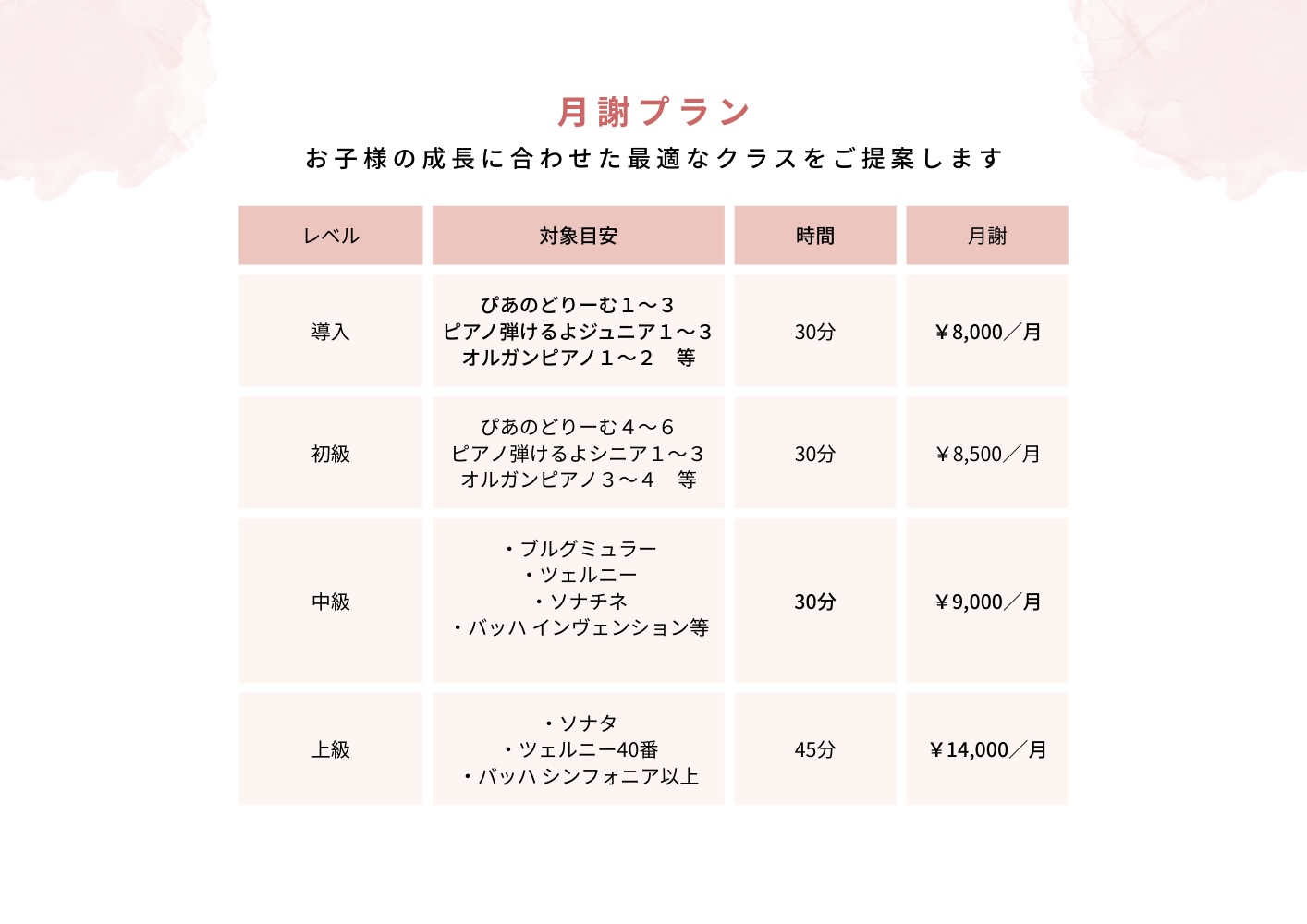 1回30分、月3回レッスン(年間34回) お月謝:7,000円(税込)ピアノコース